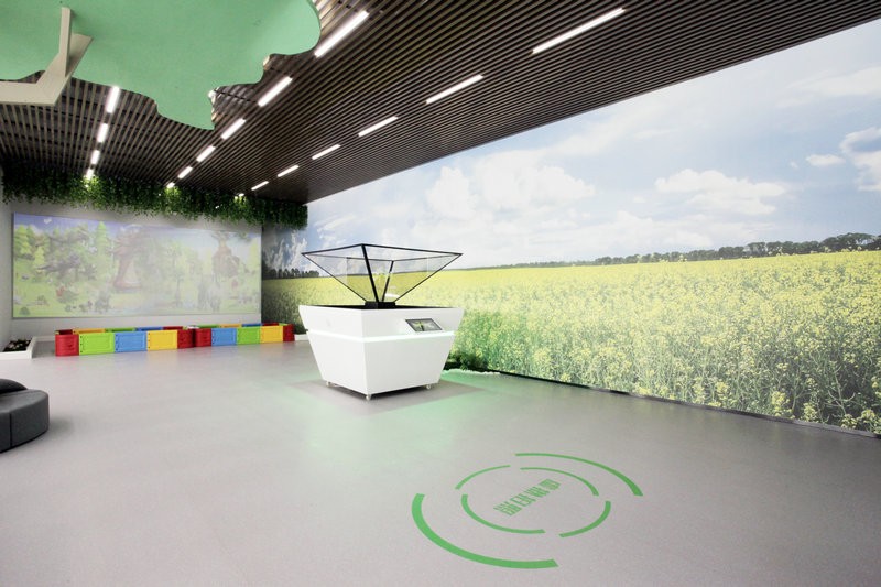 在突出數字農業展廳科技氛圍的基礎上,也要凸顯農業的生態和諧之美。所以,在色彩、形式、功能上合理搭配,用場景還原的方式營造真實的農業場景,讓參觀者身臨其境去體驗。用代表綠色生態的配色來升華成展廳的主色調,用數字展示技術展示農業內容。